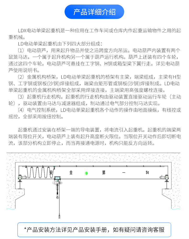 該起重機(jī)工作電源:AC 380V 50Hz,也可以根據(jù)客戶要定制。